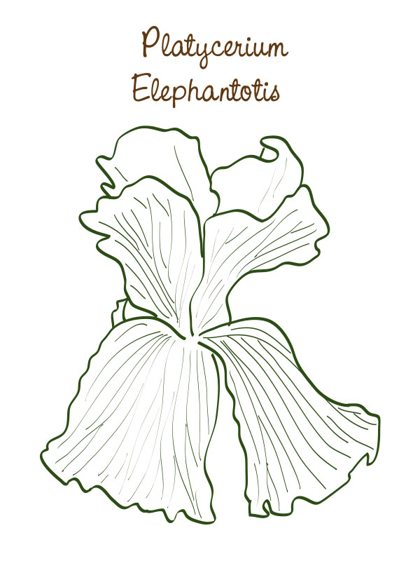 アンゴレンセ(エレファントティス)は、生長した株では縦長に伸びる貯水葉と、先端が分岐しない幅の広い胞子葉が特徴的ですが、胞子葉はさらに特徴的な形をして、同じ形で2枚の葉が展開し、その姿はゾウの耳に似ていることから「エレファント」の名がついていました。